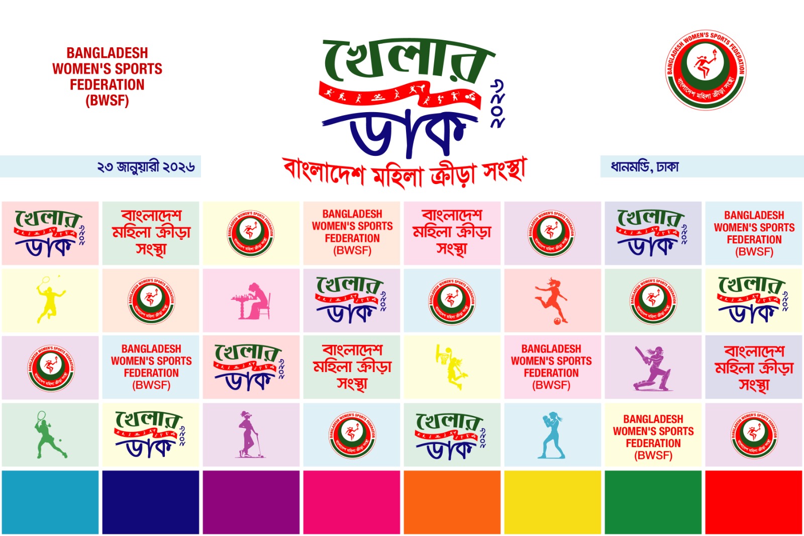 বাংলাদেশ মহিলা ক্রীড়া সংস্থার ব্যবস্থাপনায় আগামী ২৩ জানুয়ারি ২০২৬ইং, শুক্রবার সকাল ৯টা থেকে দুপুর ১২:৩০ মিনিট পর্যন্ত “খেলার ডাক–২০২৬” শীর্ষক একটি উৎসবমুখর আয়োজন ধানমন্ডি রিয়া গোপ মহিলা ক্রীড়া কমপ্লেক্সে অনুষ্ঠিত হবে।
